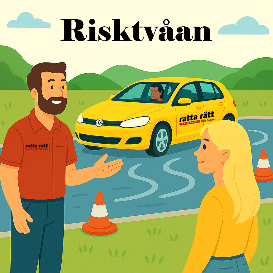 Under risktvåan kommer du få köra bil och uppleva riskfyllda situationer med halt vägunderlag. Du kommer ej göra något test under risktvåan men du måste kunna manövrera en bil för att kunna genomföra den.